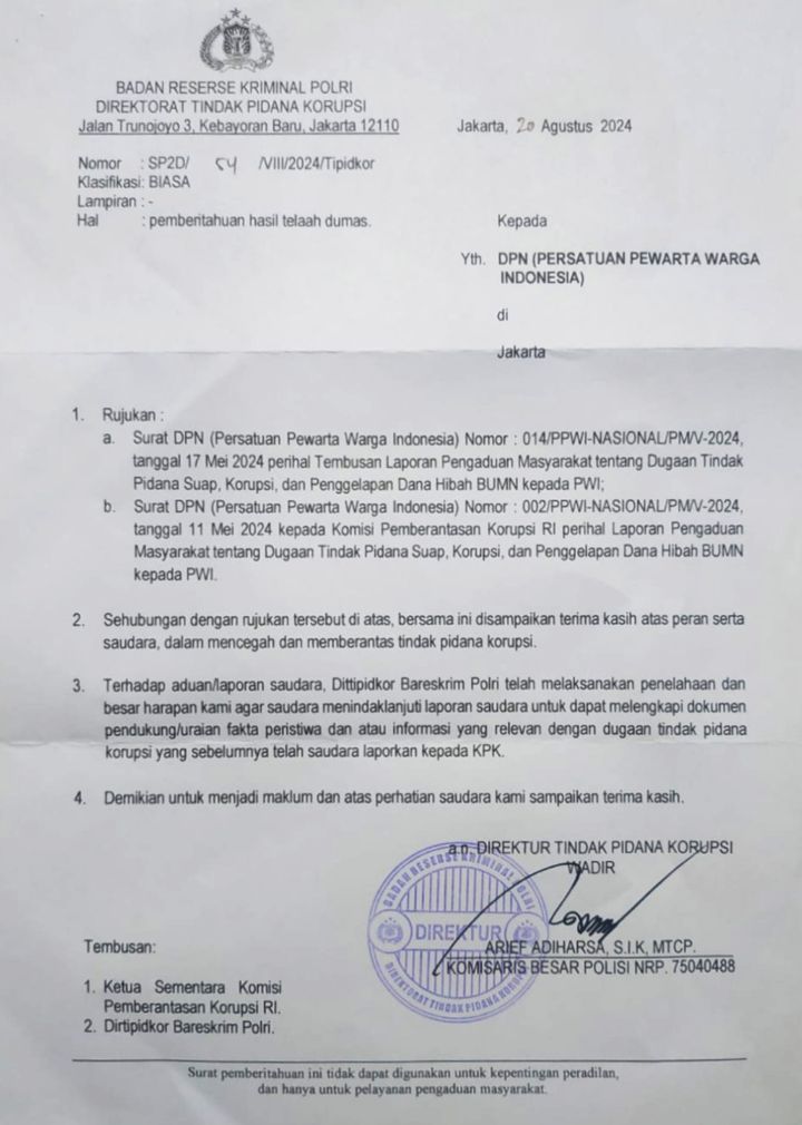 INFOINDONESIAINEWS.COM | JAKARTA – Dalam rangka menindak-lanjuti surat dari Direktorat Tindak Pidana Korupsi (Dittipikor) Mabes Polri Nomor: SP2D/54/VIII/2024/Tipikor, tanggal 29 Agustus 2024, bersama ini disampaikan bahwa Ketua Umum Persatuan Pewarta Warga Indonesia (Ketum PPWI), Wilson Lalengke, S.Pd, M.Sc, MA, akan mengunjungi Bareskrim Polri, pada: