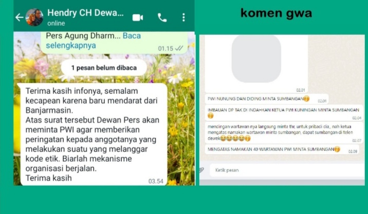 Komentar lain begini: IMBAUAN DP TAK DI INDAHKAN KETUA PWI KUNINGAN MINTA SUMBANGAN. mendingan wartawan nya langsung minta thr, untuk pribadi dia,, nah Ketua mengatas namakan wartawan minta sumbangan, dapat sumbangan di telen dewek. MENGATAS NAMAKAN 40 WARTAWAN PWI MINTA SUMBANGAN.