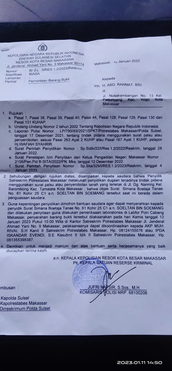 “Rincik Sultan Bin Sumang diserahkan ke polisi krn di duga palsu yg kau pakai utk menyerobot tanah H Wafiah Ishak siap kembalikan semua uang yg kau ambil dan keluargamu,” ungkap Haji Abd Rahmat alias Ajii Beddu melalui pesan WhatsApp dengan Ishak Hamzah, Rabu, 11/1/2023.