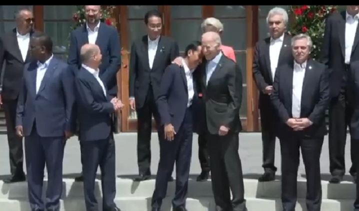 Mereka lalu mengikuti sesi foto dimana Presiden Jokowi tiba tiba dipeluk Presiden AS yang sebelumnya terlihat mencarinya, Presiden lainnya tidak menyangka keduanya bisa sangat akrab, bahkan saat disesi foto keluarga tersebut oleh panitia ,Ia diberi posisi Foto Istimewa paling depan, diapit Ketua G7 dan Presiden Joe Biden.