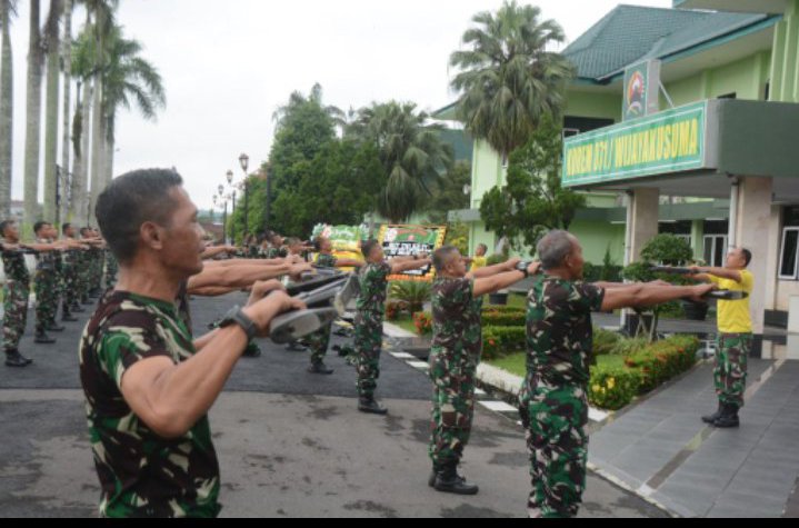 BANYUMAS | Untuk menjaga kebugaran tubuh dan melatih kemampuan fisiknya, prajurit Wijayakusuma Korem 071/Wijayakusuma usai melaksanakan Upacara Bendera lakukan senam senjata, Senin (10/10/2022) di Makorem 071/Wijayakusuma Sokaraja, Banyumas.