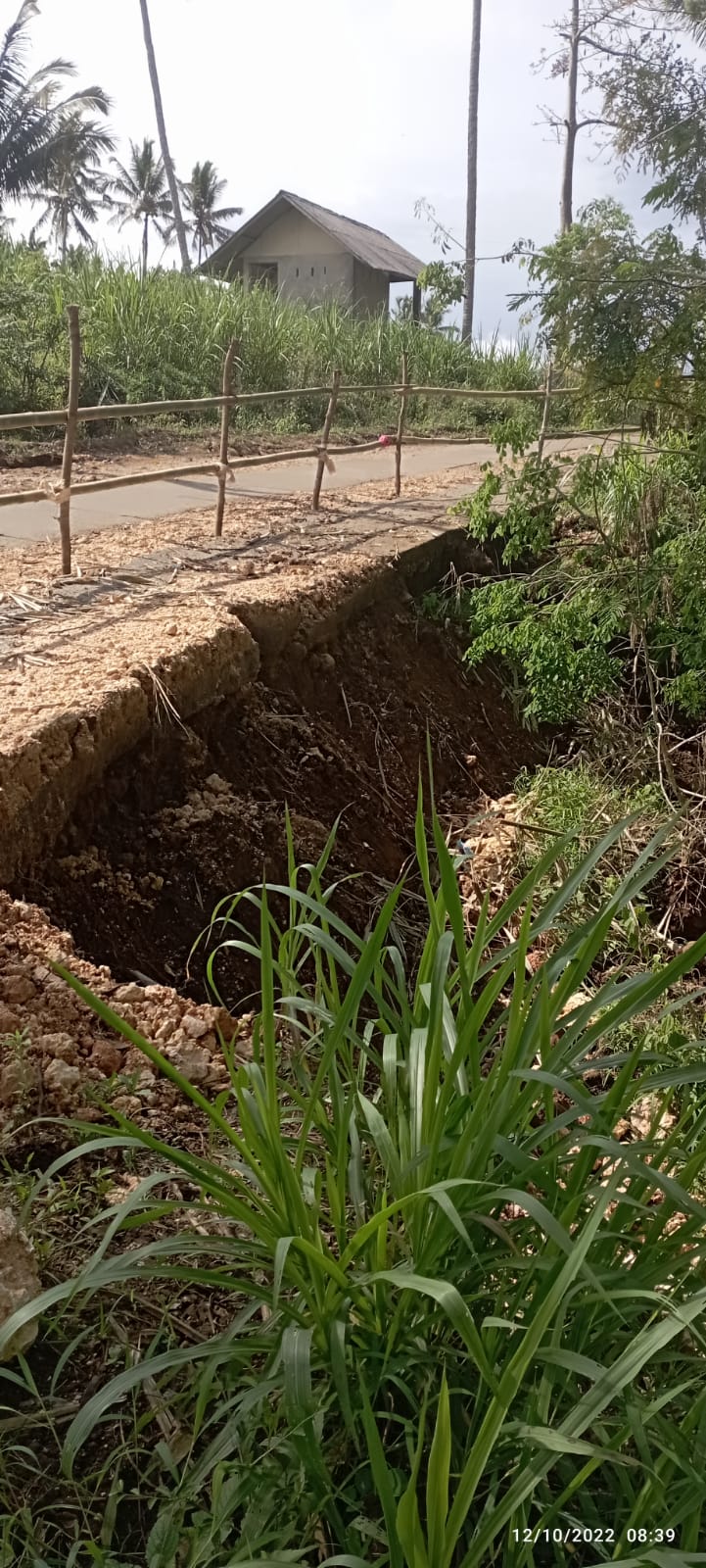Kerusakan jalan yang di akibatkan longsor yang sampai berita ini tayang belum di benai oleh pihak Desa dan sudah lama jalan yang menjadi akses utama warga untuk melakukan aktivitas sehari-hari, tentu sangat rawan sekali akan terjadinya kecelakaan mengingat jalan hanya di kasih pembatas bambu ajah