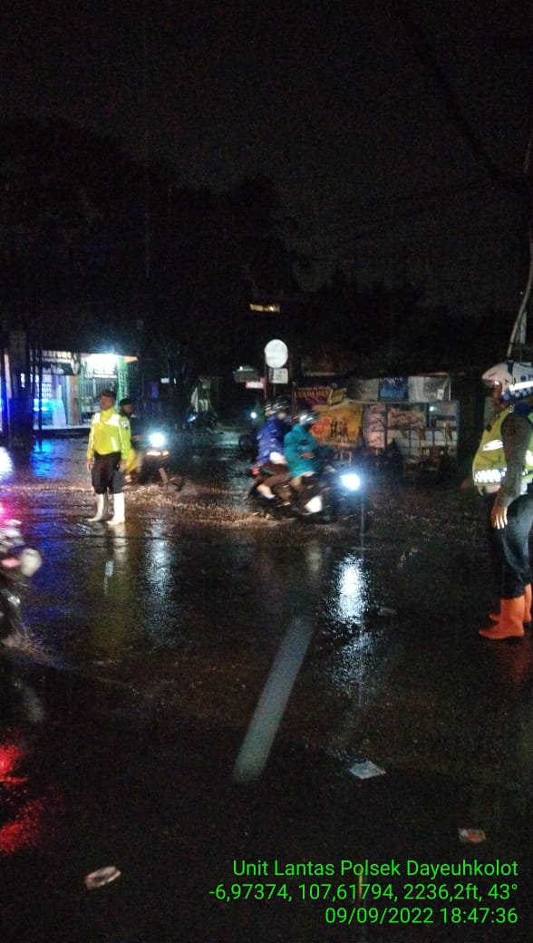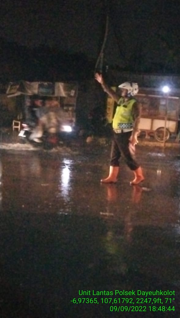 Dengan kejadian ini, Kapolsek Dayeuhkolot Kompol Tedi Rusman SE , bersama Anggota Lantas Bripka Sukendi, tanggap darurat mengatur menyelesaikan jalur transportasi darat menjadi lancar, akibat jalan raya terggeunang air curahan hujan dan kendaraan roda empat mogok . (Red).