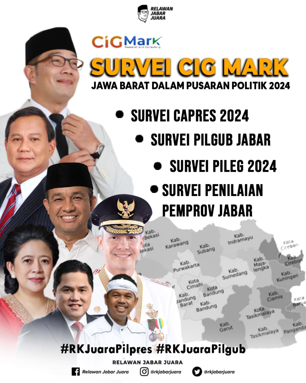Hasil survei CIGMark menunjukkan peta kekuatan calon presiden 2024 di Provinsi Jawa Barat, Ridwan Kamil (RK) yang saat ini masih menjabat gubernur mulai mendominasi. Berdasarkan pertanyaan terbuka atau Top of Mind sosok RK mengantongi dukungan paling tinggi sebesar 22,1%.