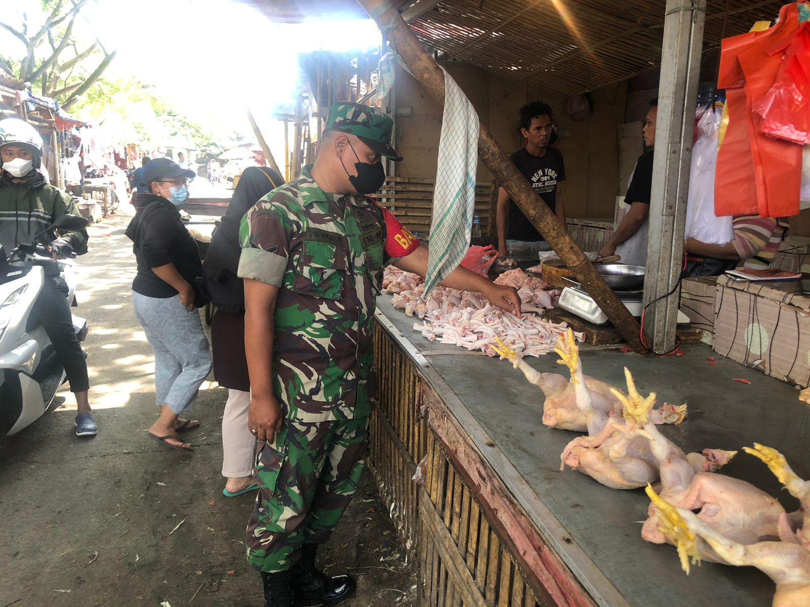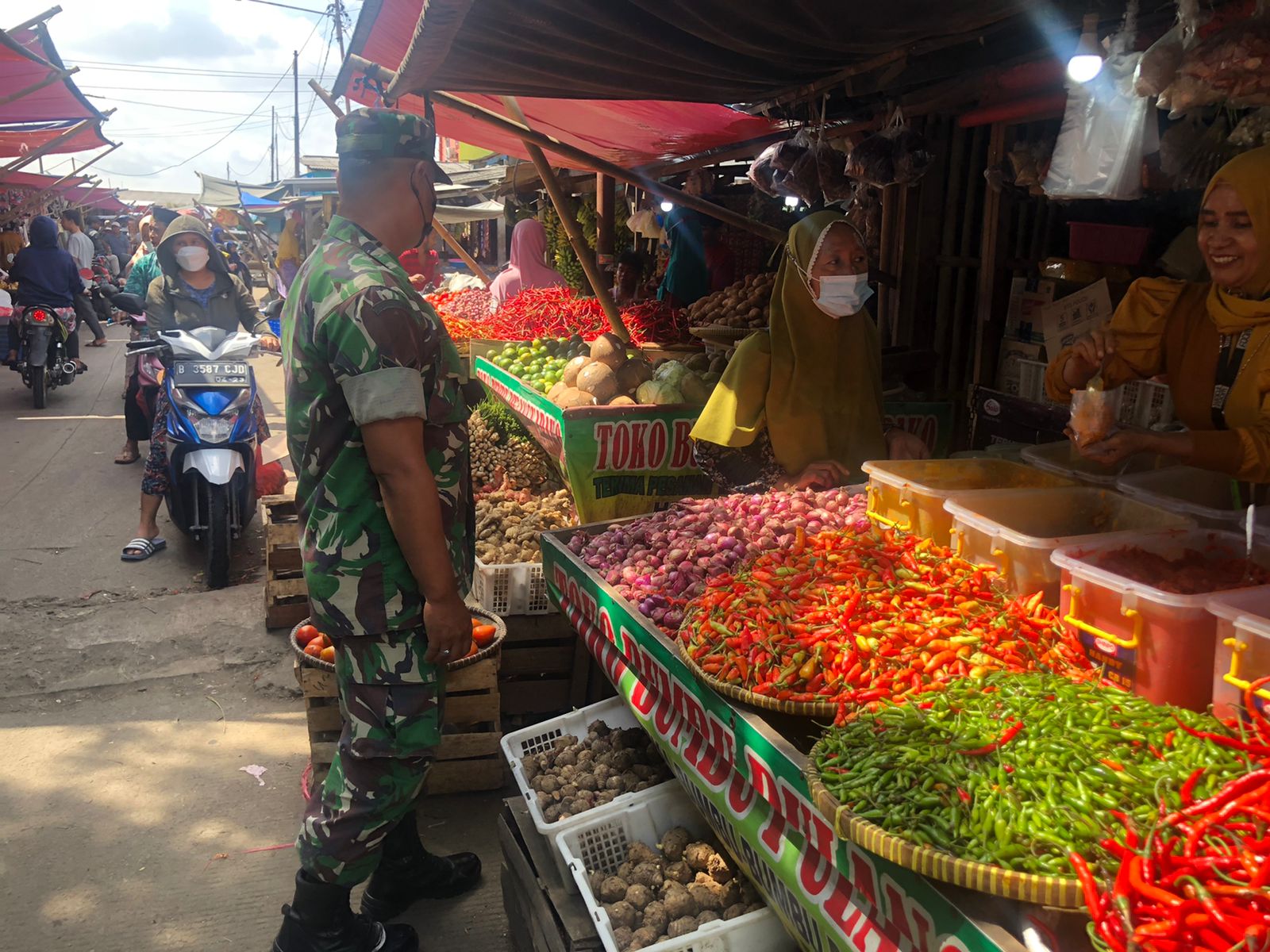 KODAM JAYA, TIGARAKSA | Menjelang datangnya bulan Ramdhan Serda Ipan Babinsa Desa Palu Alam Koramil 10/Sepatan, Kodim 0510/Trs memantau harga sembako di pasar tradisional Sepatan, Jum’at (25/03/2022).