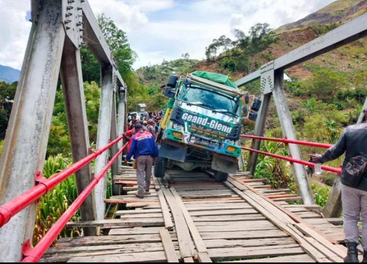 MULIA | Sejumlah mobil angkutan barang dan orang termasuk kendaraan roda dua, tertahan di ruas jalan trans Papua tepatnya di jembatan kali tingginambut Distrik Tingginambut Kabupaten Puncak Jaya tepatnya pada ruas jalan nasional Trans Papua Wamena-Mulia km 179.