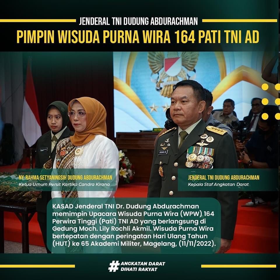 MAGELANG | KASAD Jenderal TNI Dr. Dudung Abdurachman memimpin Upacara Wisuda Purna Wira (WPW) 164 Perwira Tinggi (Pati) TNI AD yang berlangsung di Gedung Moch. Lily Rochli Akmil. Wisuda Purna Wira bertepatan dengan peringatan Hari Ulang Tahun (HUT) ke 65 Akademi Militer, Magelang, (11/11/2022).