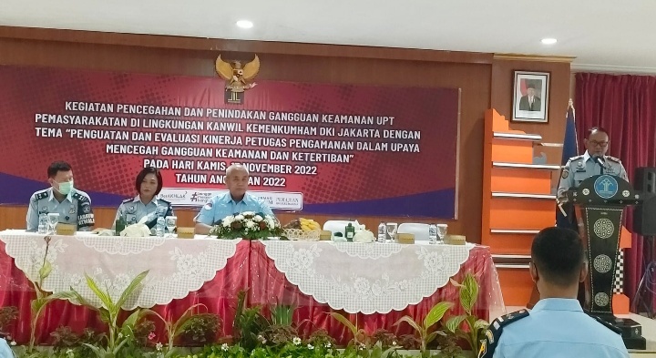 JAKARTA | Dalam rangka pencegahan dan penindakan gangguan keamanan dan ketertiban UPT Pemasyarakatan di lingkungan Kanwil Kemenkumham DKI Jakarta, Kepala Rutan Kelas I Jakarta Pusat Fauzi Harahap beserta Jajaran SATOPSPATNAL mengikuti giat Penguatan dan Evaluasi Kinerja Petugas Pengamanan Dalam Upaya Mencegah Gangguan Keamanan dan Ketertiban, Kamis (17/11).