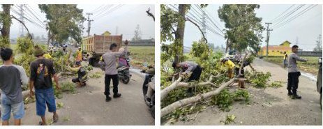 CILULUK, JABAR | Kapolsek Cikancung Polresta Bandung Polda Jabar yang diwakili oleh Piket Pawas Kanit Propam Polsek Cikancung Aiptu Yadi Junaedi serta Personil Polsek, petugas PU dan masyarakat evakuasi pohon yang tumbang di Jl. Rata Cijapati tepatnya Kp. Sindangsari Desa Ciluluk.
