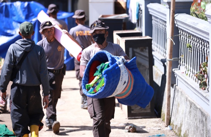 CIANJUR, JABAR | Polri senantiasa membantu masyarakat Kab. Cianjur dalam menghadapi kehidupan sehari-hari dalam pengungsian baik membantu proses pencarian dan evakuasi, menyiapkan dapur umum, tenda darurat hingga memindahkan barang-barang milik warga, Sabtu (17/12/2022)