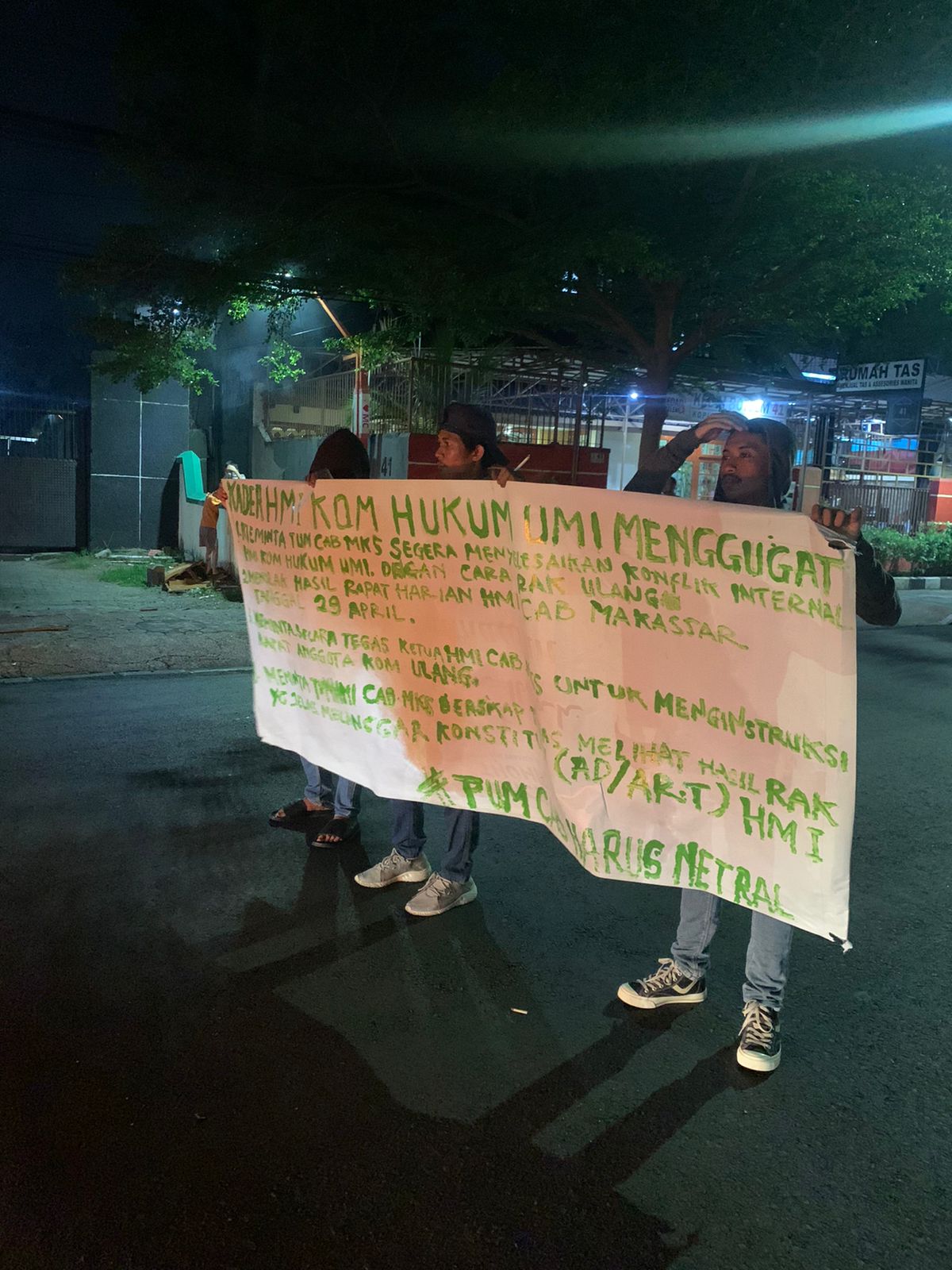 Kemudian para massa aksi juga menyesali sikap Ketua Umum HmI Cabang Makassar Arsy Jailolo karena secara terburu-buru telah melakukan rapat harian dan mengesahkan berkas salah satu kandidat calon ketua umum HmI Kom. Hukum UMI padahal Ketua Hmi Cabang Makassar Arsy Jailolo itu sendiri berasal dari Komisariat Hukum UMI. proses pemilihan tidak dilaksanakan secara jujur, adil dan tidak melibatkan partisipasi kader HmI Kom. Hukum UMI secara menyeluruh.