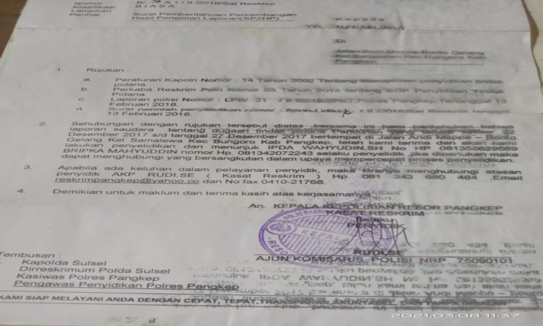 Terpisah, Kasat Reskrim Polres Kabupaten Pangkep, Anita, yang dikonfirmasi oleh media ini, mengatakan, kasus ini sudah lama, nanti Kami menyampaikan ke penyidik.