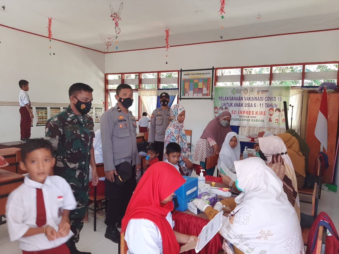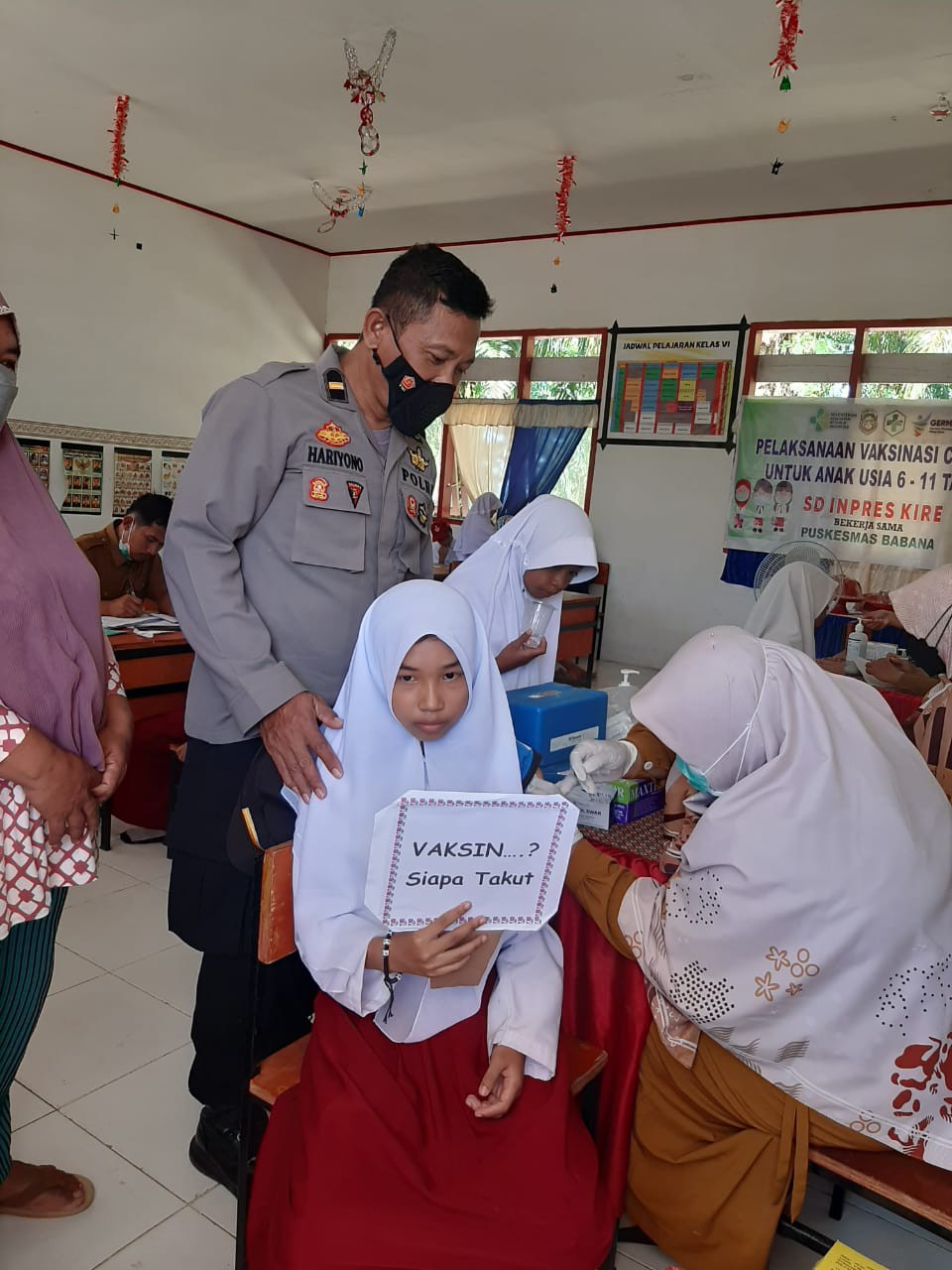 POLRES MAMUJU TENGAH | IPDA Hariyono Kanit Intel Polsek Budong-Budong bersama Personil Polsek Budong-Budong melaksanakan pengamanan dan monitoring pelaksanaan vaksinasi Covid-19 bagi anak usia 6 sampai dengan 11 tahun di SD Inpres Desa Kire Kecamatan Budong-Budong Kabupaten Mamuju Tengah. Selasa (01/03/2022) pukul 09.30 Wita
