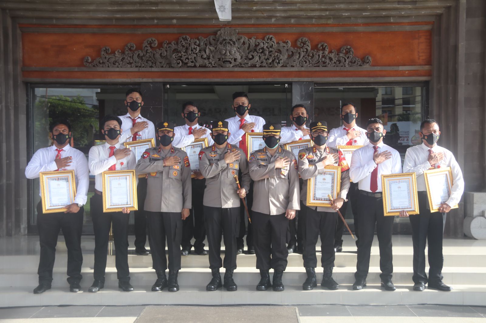 BALI | Kepala Kepolisian Daerah Bali Irjen. Pol. Drs. Putu Jayan Danu Putra, S.H., M.Si., memberikan penghargaan kepada personel satresnarkoba Polresta Denpasar yang berprestasi dalam pengungkapan kasus narkotika jenis shabu dan extasi. pemberian penghargaan tersebut dilaksanakan dikala Kapoda Bali memimpin apel pagi, Senin (7/3/2022).