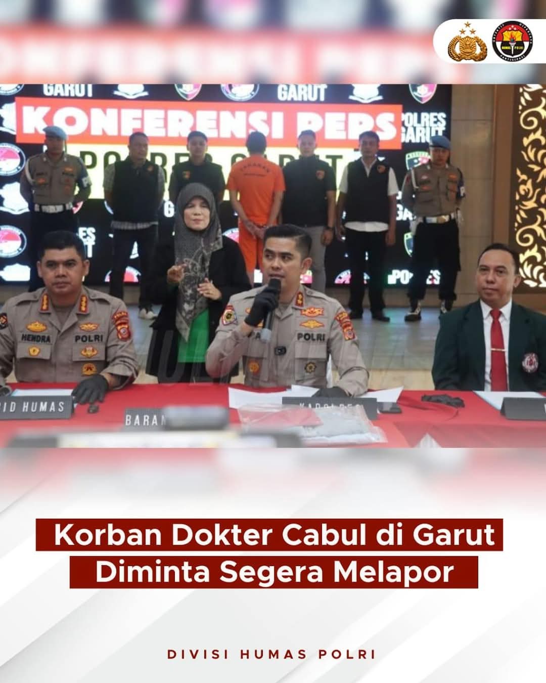 POLRES GARUT – Polri melalui Kapolres Garut AKBP Mochammad Fajar Gemilang AKBP Mochammad Fajar Gemilang, S.I.K., M.H., M.I.K., menghimbau masyarakat yang merasa menjadi korban pelecehan seksual yang dilakukan oleh tersangka MSF (33), pria,alias Dokter Iril agar segara melapor ke Polres Garut.