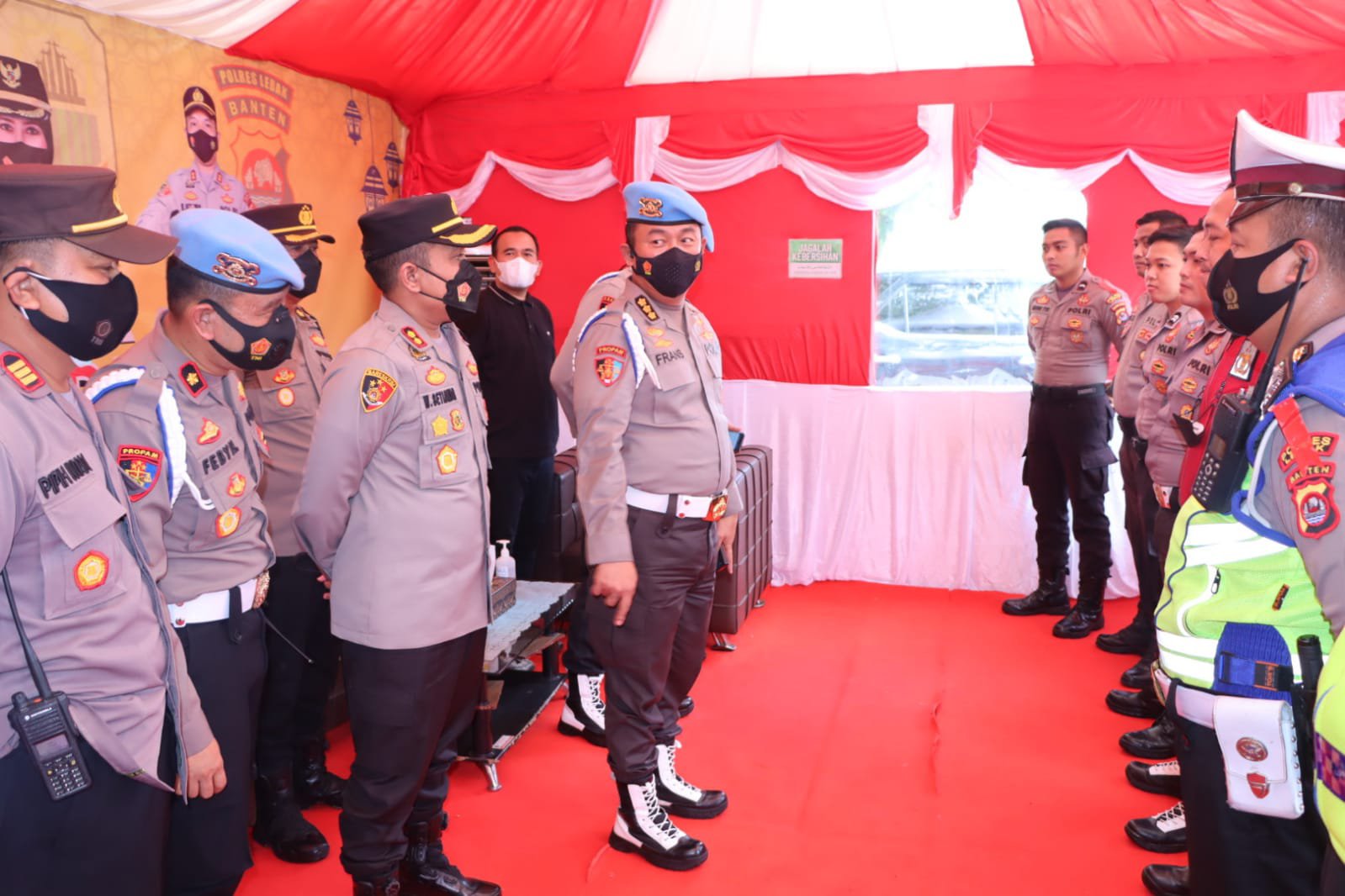 Tim Divpropam Mabes Polri dipimpin oleh Anjak Madya Divpropam Polri KOMBES POL Frans Santoe, S.I.K. dan didampingi oleh Kasubdit Provos Polda Banten KOMPOL Febi bersama tim melaksanakan pengecekan ke Posyan Mandala dan Pospam Alun-alun Rangkasbitung Ops Ketupat Maung 2022 Polres Lebak.