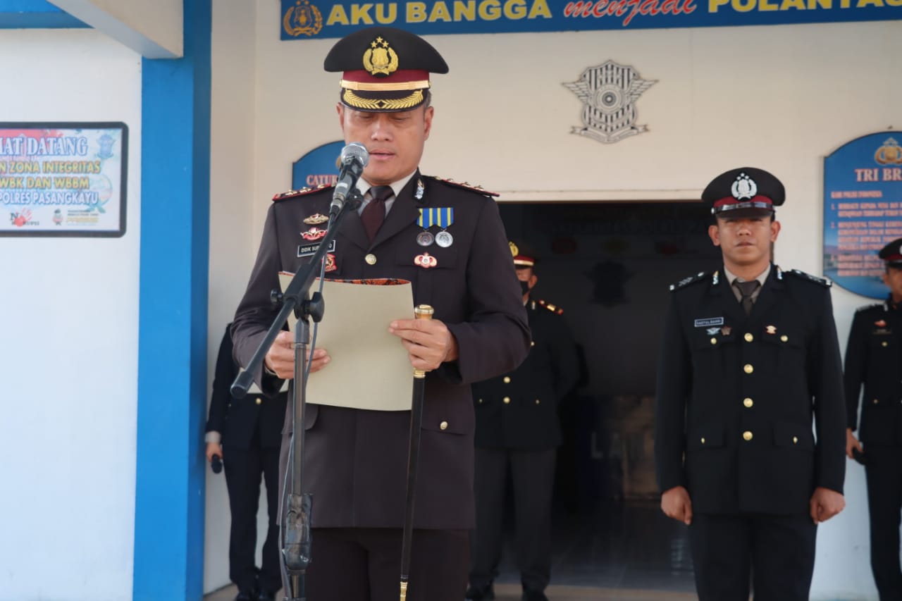 Bertindak selaku Inspektur Upacara Kapolres Pasangkayu AKBP Didik Subiyakto S.H, M.M, Perwira Upacara Kabag SDM Polres Pasangkayu AKP Sujarwo S.H, Komandan Upacara Kasubbag Log IPDA Suardi S.H sedangkan peserta upacara terdiri dari Pejabat Utama, para Kapolsek Jajaran, Perwira dan Personel Bintara Polres Pasangkayu.