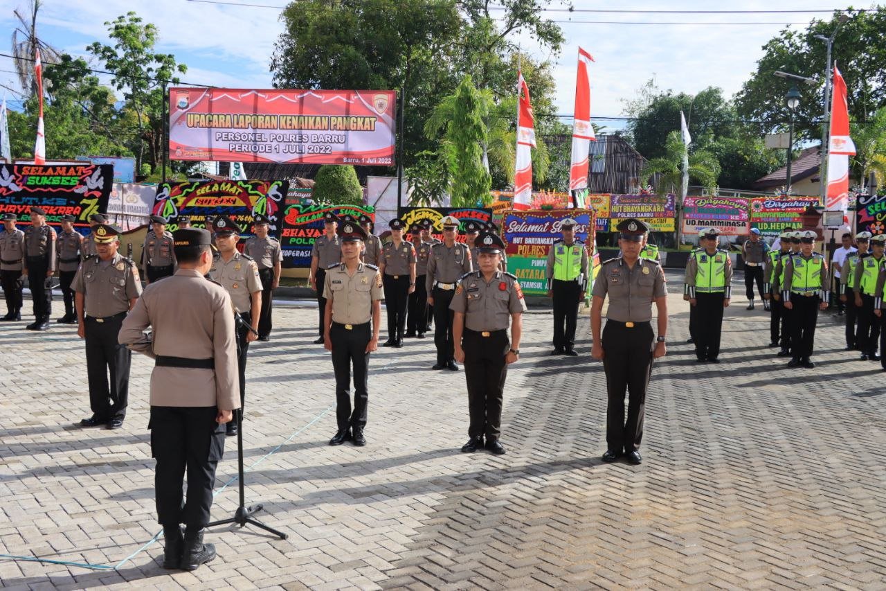 BARRU | Kapolres Barru AKBP Yudha Wirajati SIK., MH., Memimpin Upacara Laporan Kenaikan Pangkat Personel Polres Barru di Halaman Mapolres Barru, Jumat (1/7/2022).
