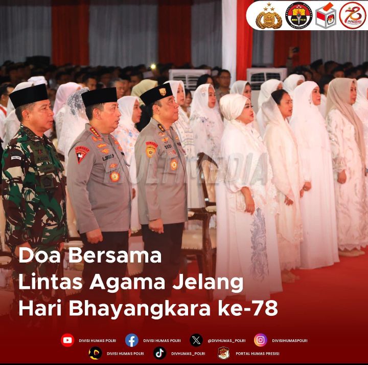 Kapolri Jenderal Polisi Drs. Listyo Sigit Prabowo, M.Si., dan Panglima TNI Jenderal TNI H. Agus Subiyanto, S.E., M.Si., menghadiri doa bersama lintas agama menjelang Hari Bhayangkara ke-78.