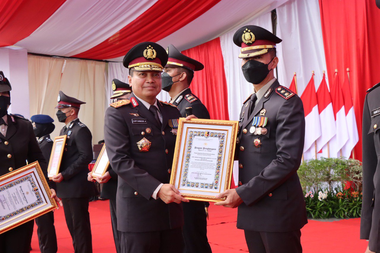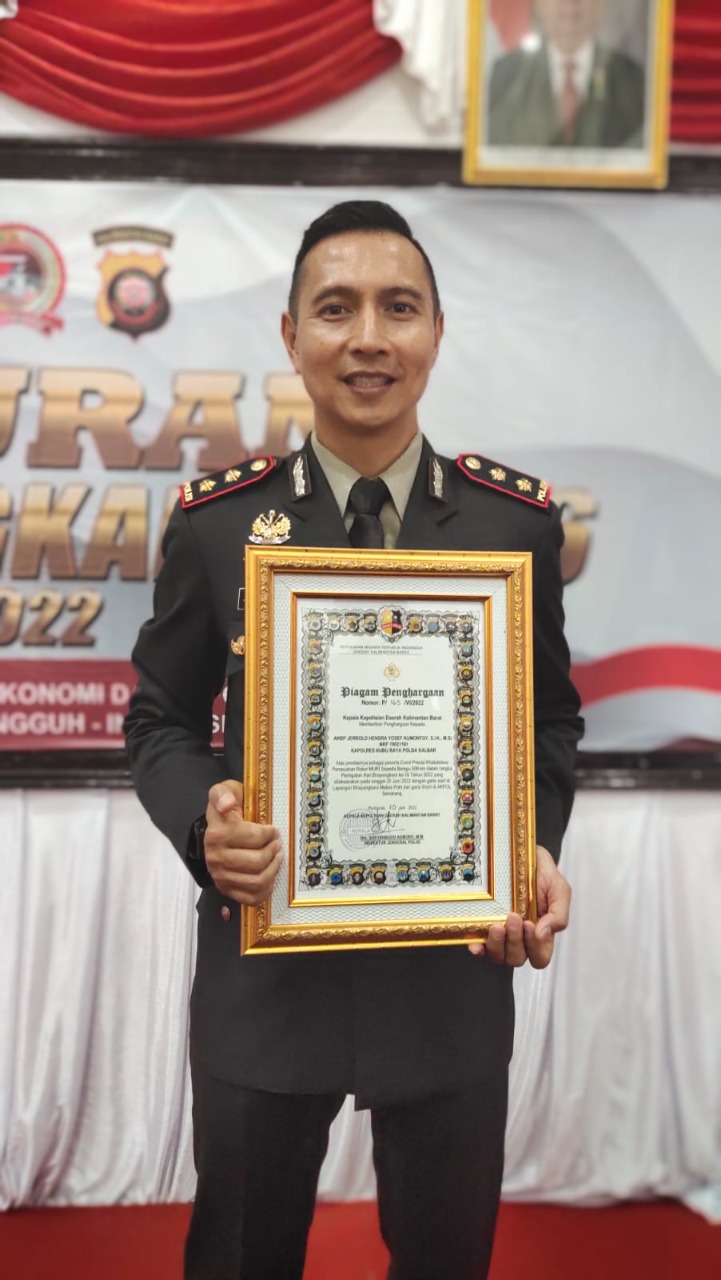 Penghargaan ini langsung di berikan Kapolda Kalbar Irjen Pol. Suryanbodo Asmoro kepada Kapolres Kubu Raya AKBP Jerrold H.Y. Kumontoy pada saat upacara memperingati Hari Bhayangkara ke-76 yang dihadiri Gubernur Kalimantan Barat H. Sutarmidji, SH. M.Hum, Pangdam XII Tanjungpura Mayjen TNI Sulaiman Agusto, Ketua DPRD Prov KALBAR M. Kebing L., Kajati KALBAR Dr. Masyhudi, Ketua Pengadilan Tinggi Pontianak H. Iri Hermansyah, Danlanud Supadio Marsma TNI Deni Hasoloan Simanjuntak, Danlantamal Pontianak Laksamana Pertama TNI Suharto, Kabinda Kalbar Brigjen Pol Rudy Trenggono, Ka BNNP Kalbar Brigjen Pol Budi Wibowo, Walikota Pontianak Edi Rusdi Kamtono, Bupati Kubu Raya H. Muda Mahendrawan, dan PJU Polda Kalbar di Lapangan Apel Jananuraga Polda Kalbar, Selsa (5/7/22).