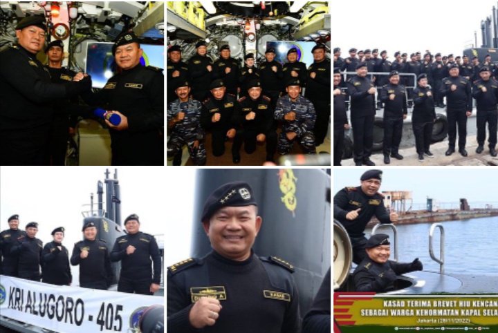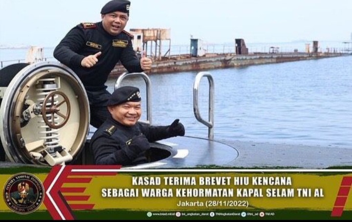 JAKARTA | Kapala Staf TNI AD Jenderal TNI Dr. Dudung Abdurachman diangkat menjadi warga kehormatan kapal selam TNI Angkatan Laut sekaligus menerima brevet kehormatan Hiu Kencana yang disematkan langsung oleh Kepala Staf Angkatan Laut (Kasal) Laksamana TNI Yudo Margono di dalam kapal selam New KRI Alugoro -405, Jakarta, Senin (28/11/2022).