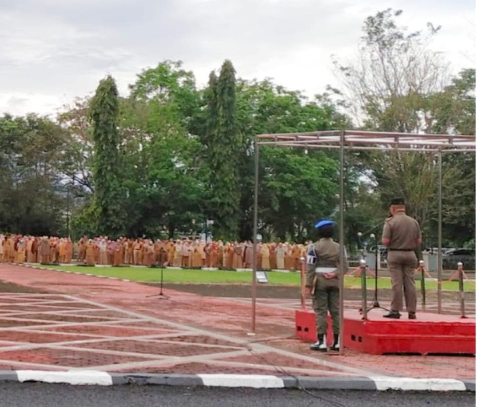 Dirangkai dengan Upacara Bendera, Kasatpol PP dan Damkar Drs. Andi Djalil Mappiare bertindak sebagai Inspektur Upacara di Lapangan Kantor Bupati Barru, Senin (18/7/2022).