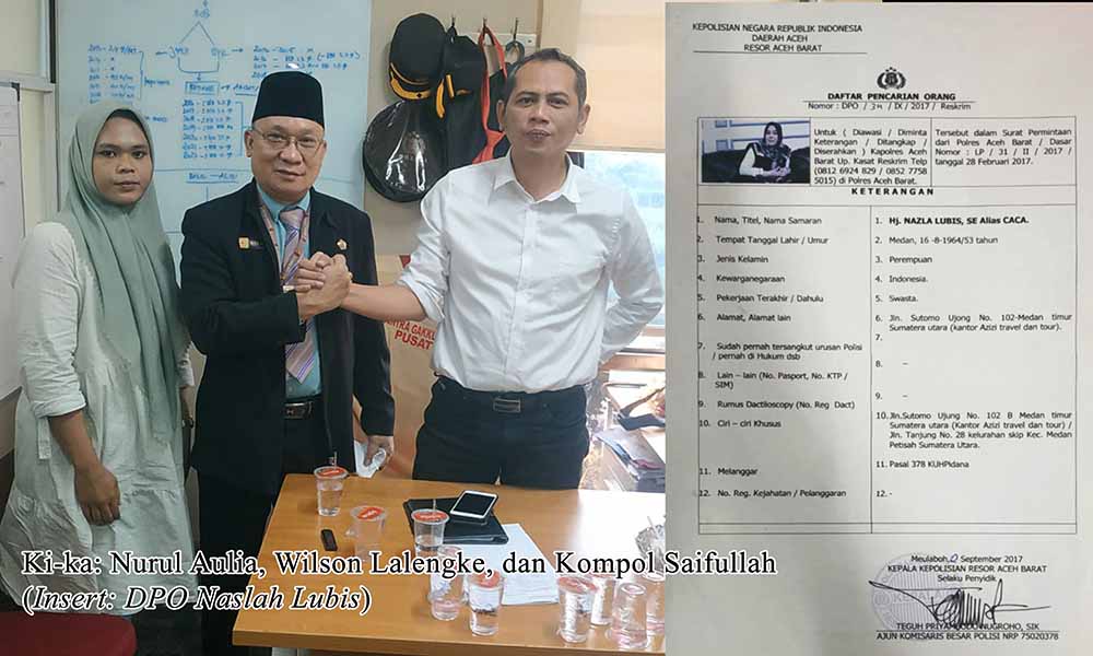 Dalam pertemuan itu juga terungkap bahwa Direktur PT. Azizi Tour & Travel, Naslah Lubis telah ditetapkan sebagai tersangka dan dinyatakan masuk dalam Daftar Pencarian Orang (DPO) oleh Polres Aceh Barat sejak 12 September 2017. Aneh bin ajaib, setelah berjalan lebih dari 6 tahun sebagai DPO, Naslah Lubis belum tertangkap.