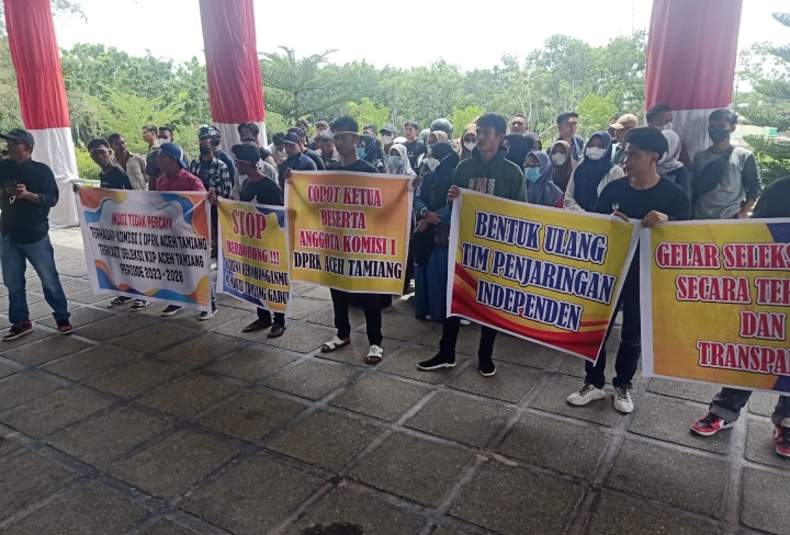 Komisi I DPRK Aceh Tamiang terkesan tidak memiliki niat baik untuk memperbaiki berbagai dugaan pelanggaran yang telah terjadi. Bahkan DPRK terindikasi memaksakan kehendak untuk mengusulkan kembali calon terpilih dan cadangan anggota KIP yang terindikasi ditetapkan secara tidak sah dan cacat hukum ke KPU RI. Oleh karena itu sekitar seratusan massa yang mengatasnamakan Forum Masyarakat Peduli Tamiang (FPMT) menggelar aksi unjuk rasa di depan Gedung DPRK Aceh Tamiang, Kamis (31/08/2023).