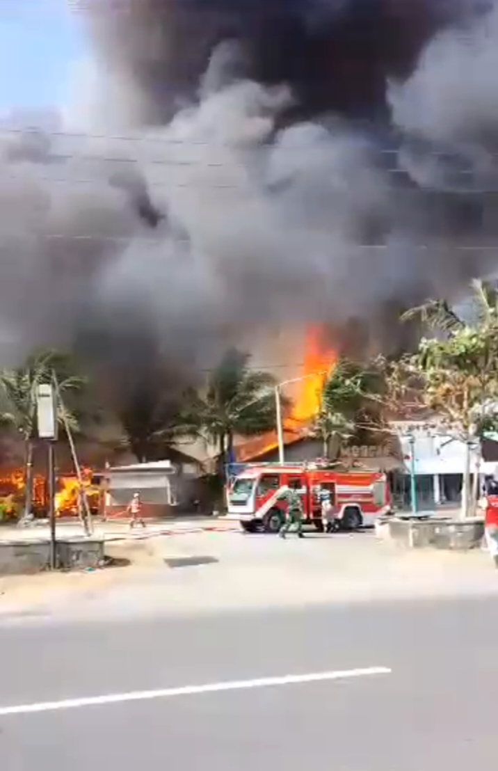 PANGANDARAN, JABAR | Tiga kafe di Kampung Turis Blok Pamugaran Kecamatan Pangandaran Kabupaten Pangandaran kebakaran, Kamis 31 Agustus 2023 pagi. Petugas damkar berupaya memadamkan api. Terlihat sejumlah petugas pemadam kebakaran (Damkar) berjibaku melakukan pemadaman api.
