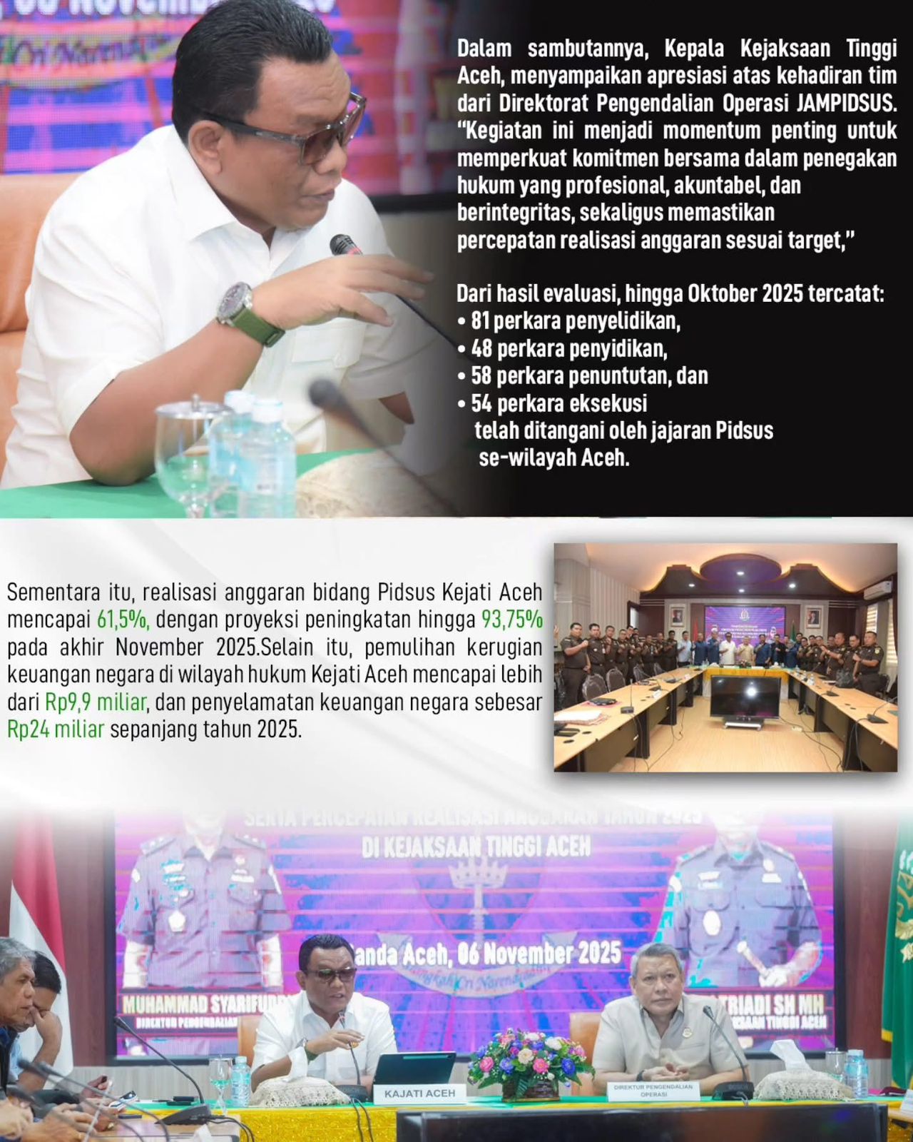Sementara itu, realisasi anggaran bidang Pidsus Kejati Aceh mencapai 61,5%, dengan proyeksi peningkatan hingga 93,75% pada akhir November 2025.