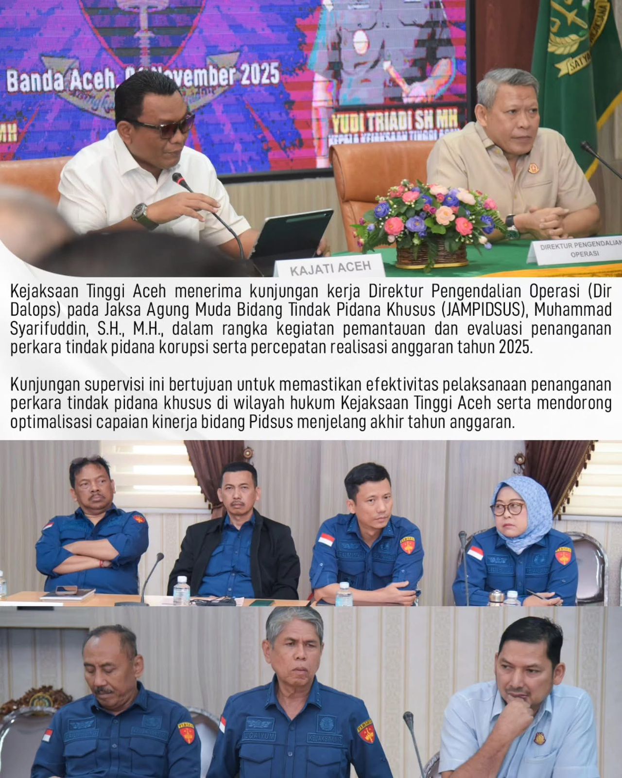 Kunjungan supervisi ini bertujuan untuk memastikan efektivitas pelaksanaan penanganan perkara tindak pidana khusus di wilayah hukum Kejaksaan Tinggi Aceh serta mendorong optimalisasi capaian kinerja bidang Pidsus menjelang akhir tahun anggaran.