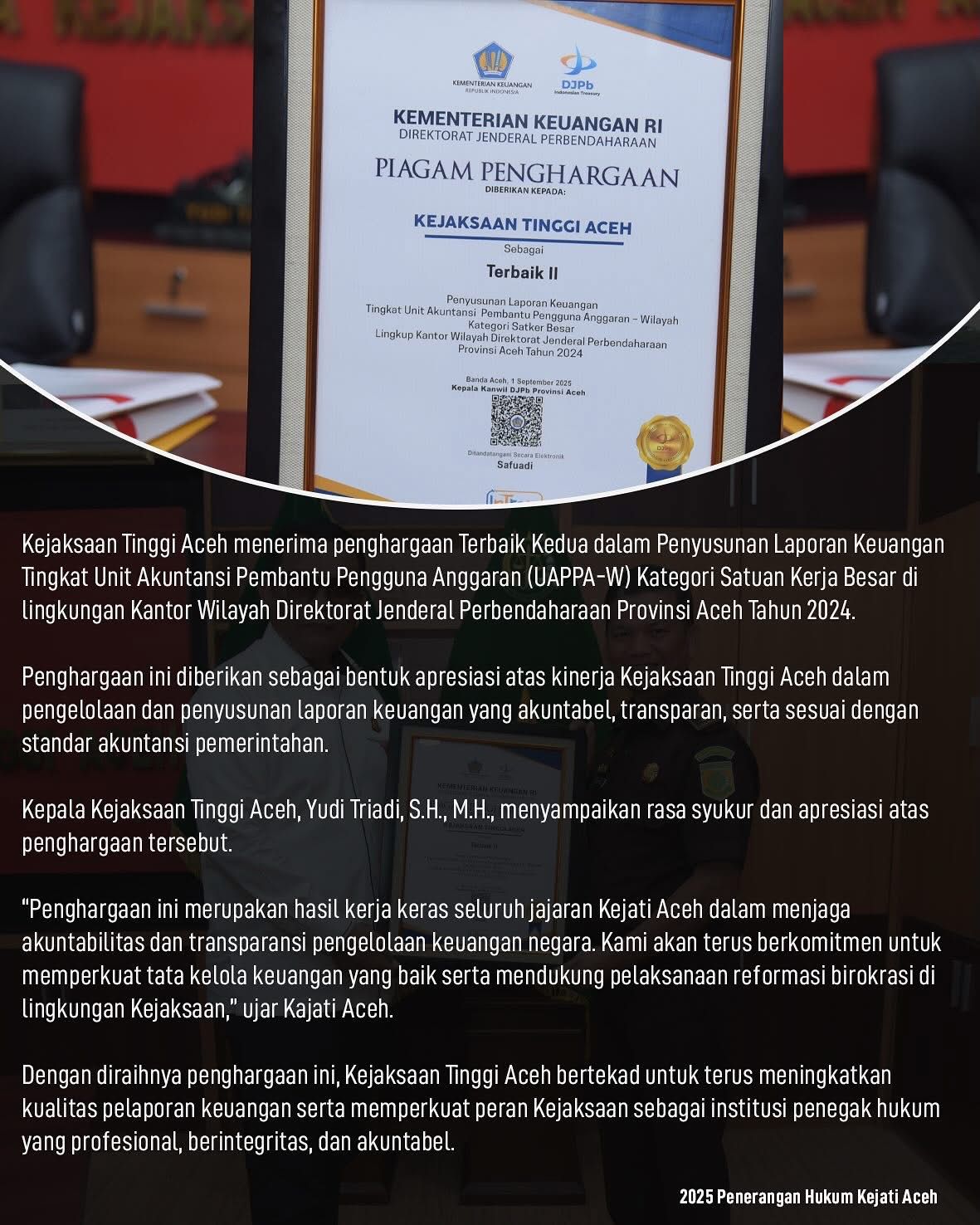 Pengelolaan dan penyusunan laporan keuangan yang akuntabel, transparan, serta sesuai dengan standar akuntansi pemerintahan, maka Kejaksaan Tinggi Aceh menerima penghargaan Terbaik nya yang Kedua kalinya.