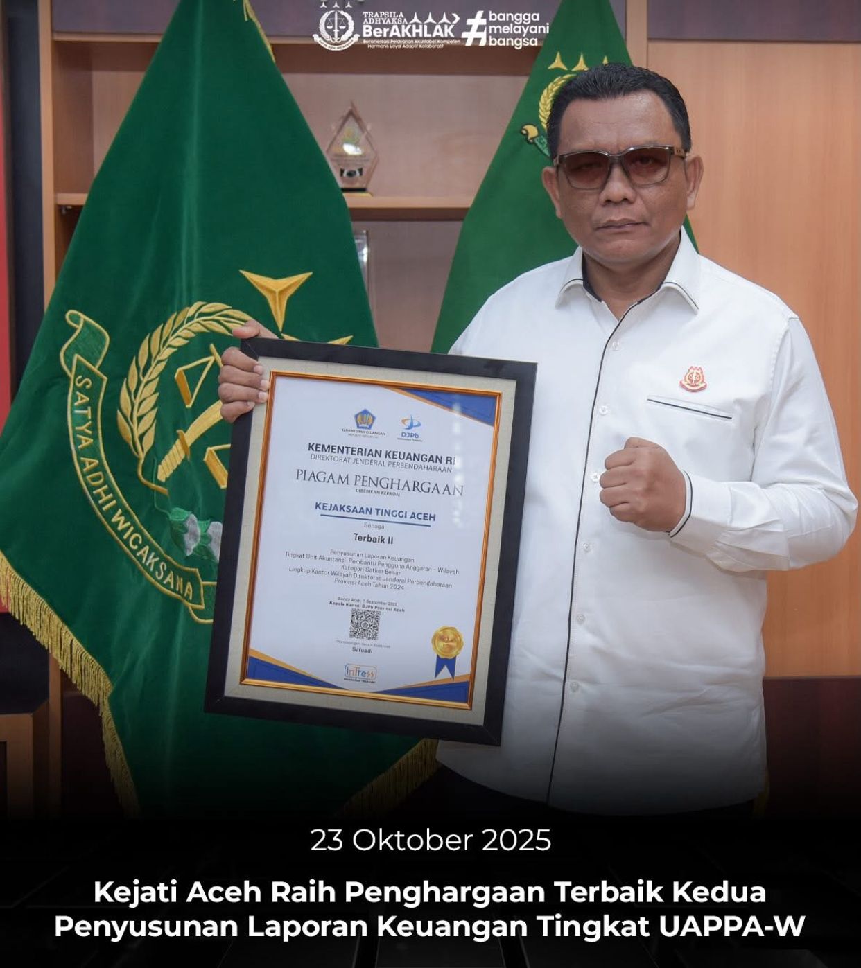 ACEH – Kejaksaan Tinggi Aceh menerima penghargaan Terbaik Kedua dalam Penyusunan Laporan Keuangan Tingkat Unit Akuntansi Pembantu Pengguna Anggaran (UAPPA-W), Kategori Satuan Kerja Besar di lingkungan Kantor Wilayah Direktorat Jenderal Perbendaharaan Provinsi Aceh Tahun 2024.
