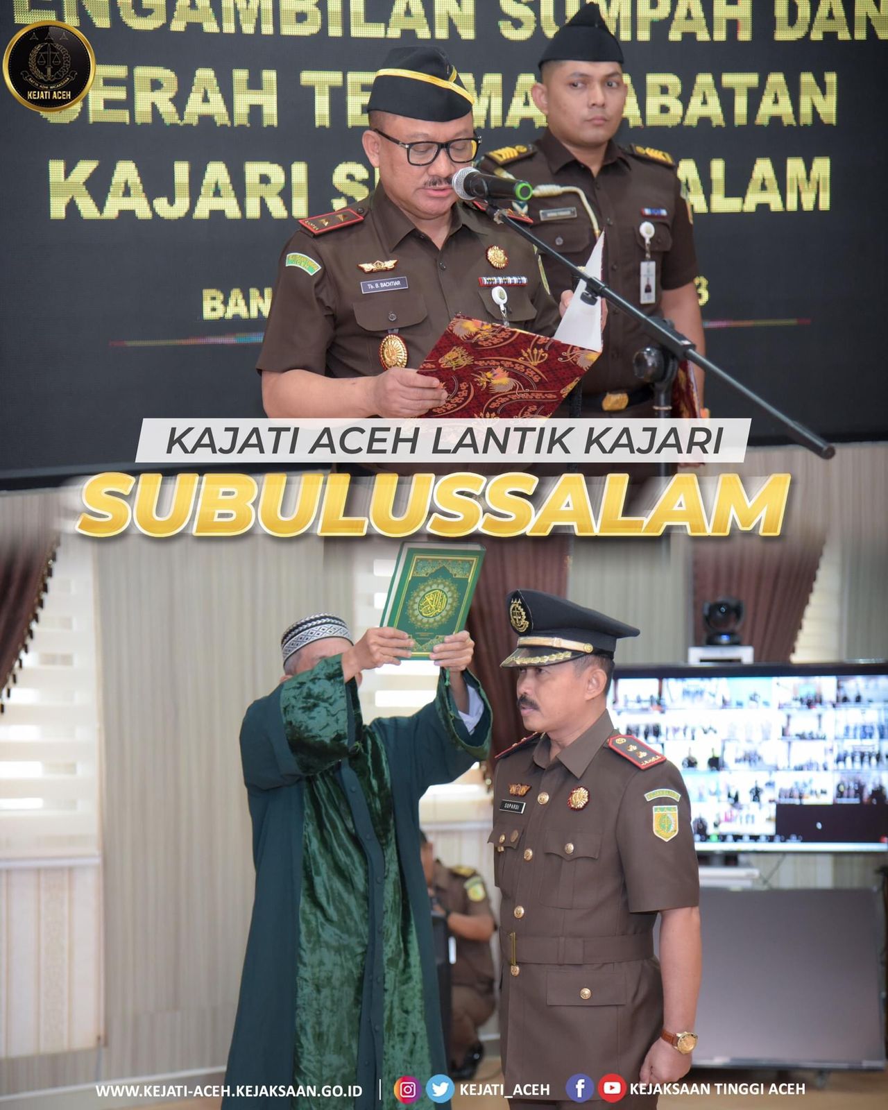 infoindonesiainews.com | SUBULUSSALAM, ACEH – Kepala Kejaksaan Tinggi Aceh Bapak Bambang Bachtiar, S.H.,M.H memimpin upacara pelantikan, pengambilan sumpah dan serah terima jabatan Kepala Kejaksaan Negeri Subulussalam. bertempat di ruang rapat lantai II Kejati Aceh Senin 14 Agustus 2023