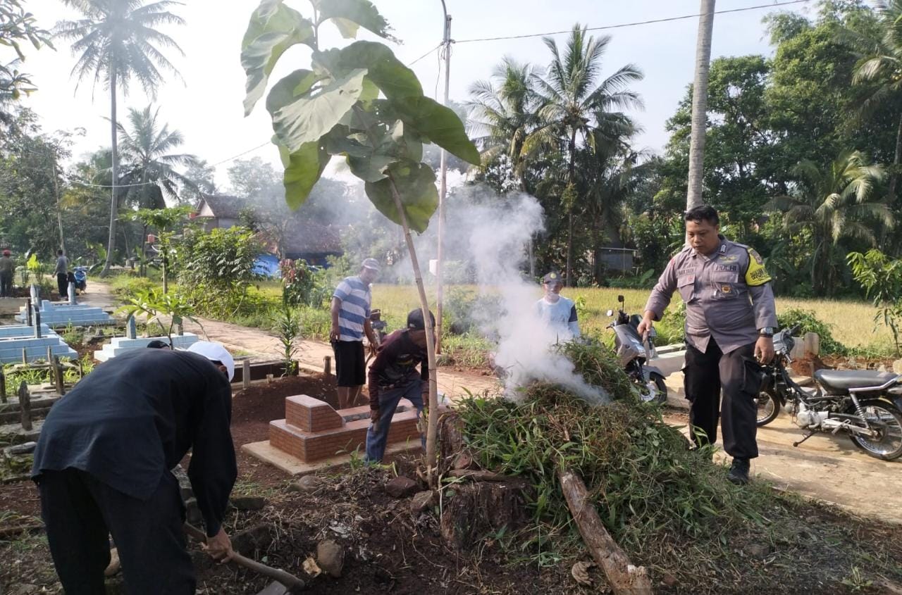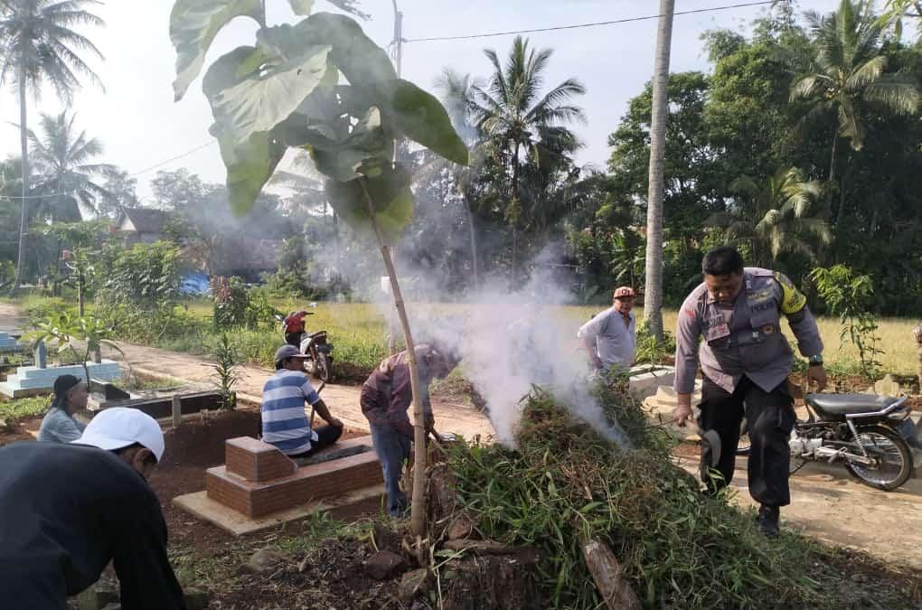 INFOINDONESIA – POLRES KUNINGAN | Polsek Ciawigebang Polres Kuningan Polda Jabar, Kapolsek Ciawigebang bersama Bhabinkamtibmas Desa Pajawan Lor Bripka Mulyadi bersama warga melaksanakan bakti sosial membersihkan area Tempat Pemakaman Umum (TPU) Desa binaannya. Minggu (26/3/2023).