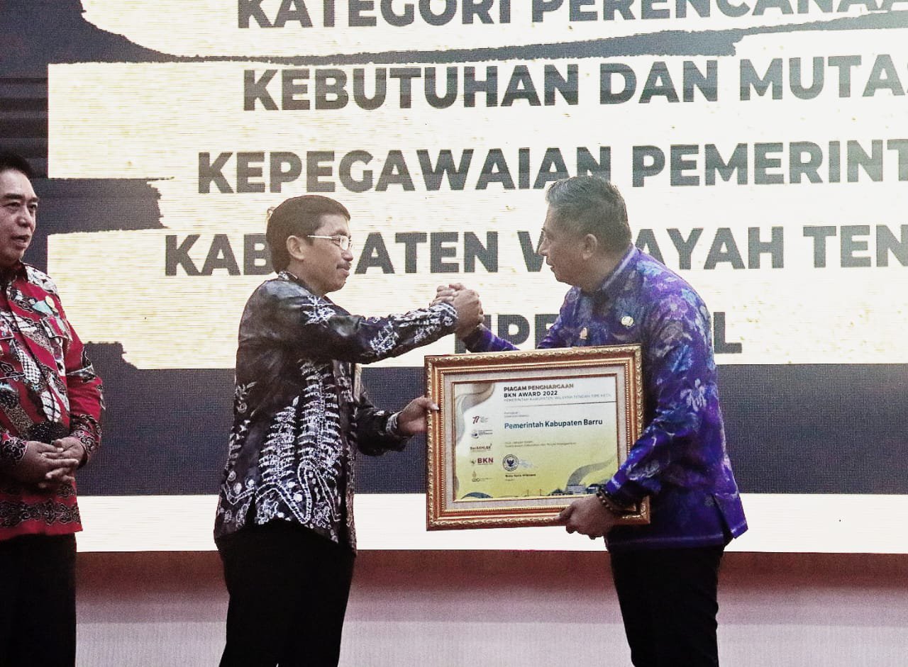 BARRU | Kabupaten Barru, kembali mendapatkan dua piagam penghargaan di BKN Award dengan kategori perencanaan kebutuhan dam mutasi kepegawaian Pemerintah Kabupaten di Wilayah Tengah Tipe Kecil dan dua The Best Kategori Implementasi Manajemen ASN Terbaik.