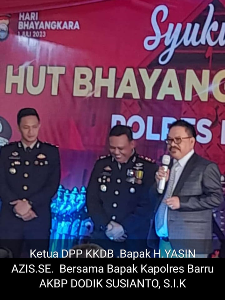 infoindonesiainews.com | BARRU – Ketua Kerukunan Keluarga Daerah Barru (KKDB) H.Muh.Yasin Azis menghadiri syukuran HUT Bhayangkara Ke-77, di Halaman Mapolres Barru, Sabtu (1/7/2023).