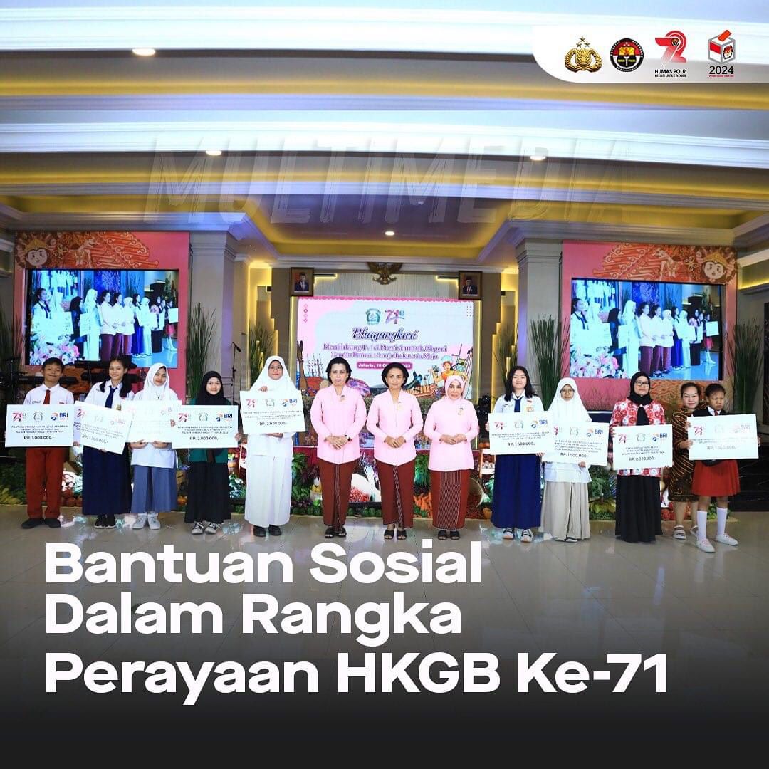 JAKARTA SELATAN | Ketua Umum (Ketum) Bhayangkari Ny. Juliati Sigit Prabowo, memberikan bantuan sosial kepada siswa berprestasi tingkat SD, SMP, dan SMA.