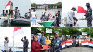 MAKASSAR | Kobarkan Semangat di Hari Kemerdekaan Republik Indonesia, prajurit Bintara Pembina Potensi Maritim (Babinpotmar) Lantamal VI Makassar bagikan Bendera Merah Putih kepada warga pesisir Makassar.