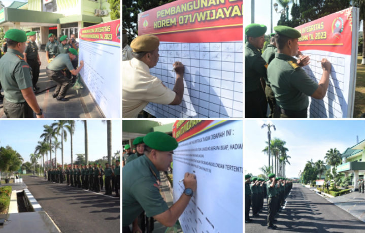 Sebagai bentuk Komitmen pembangunan zona integritas menuju wilayah bebas korupsi ini, ditandai dengan penandatanganan pakta integritas secara personal mulai dari Danrem, Kasrem, para Dandim sejajaran Korem 071/Wijayakusuma, para Kasi dan Pasirem, para Perwira, Bintara, Tantama dan PNS Makorem 071/Wijayakusuma.