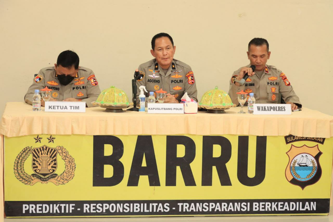 BARRU | Tim Pusat Penelitian dan Pengembangan (Puslitbang) Polri mengadakan kunjungan kerja di Polres Barru, selasa (08/11/2022) pukul 12.00 wita bertempat di Aula Wira Bhakti Satria Polres Barru Jl.Jendral Sudirman Kel.Sumpang Binangae Kec.Barru Kab.Barru.