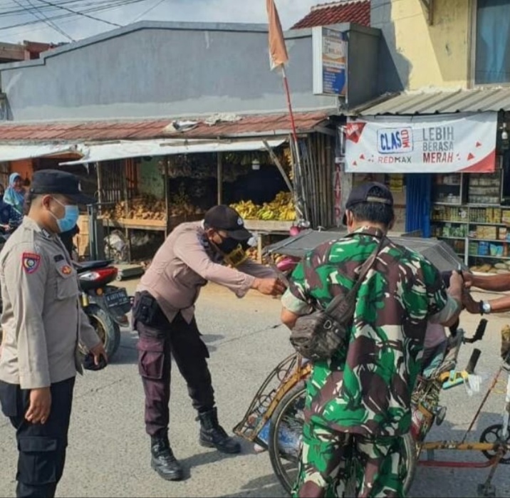 Mauk, Kab. Tangerang, Banten | Menertibkan Protokol Kesehatan pengayuh becak dan pengendara kendaraan bermotor tidak luput dari pengecekan Prokes anggota Koramil 09/Mauk Kodim 0510/Trs.