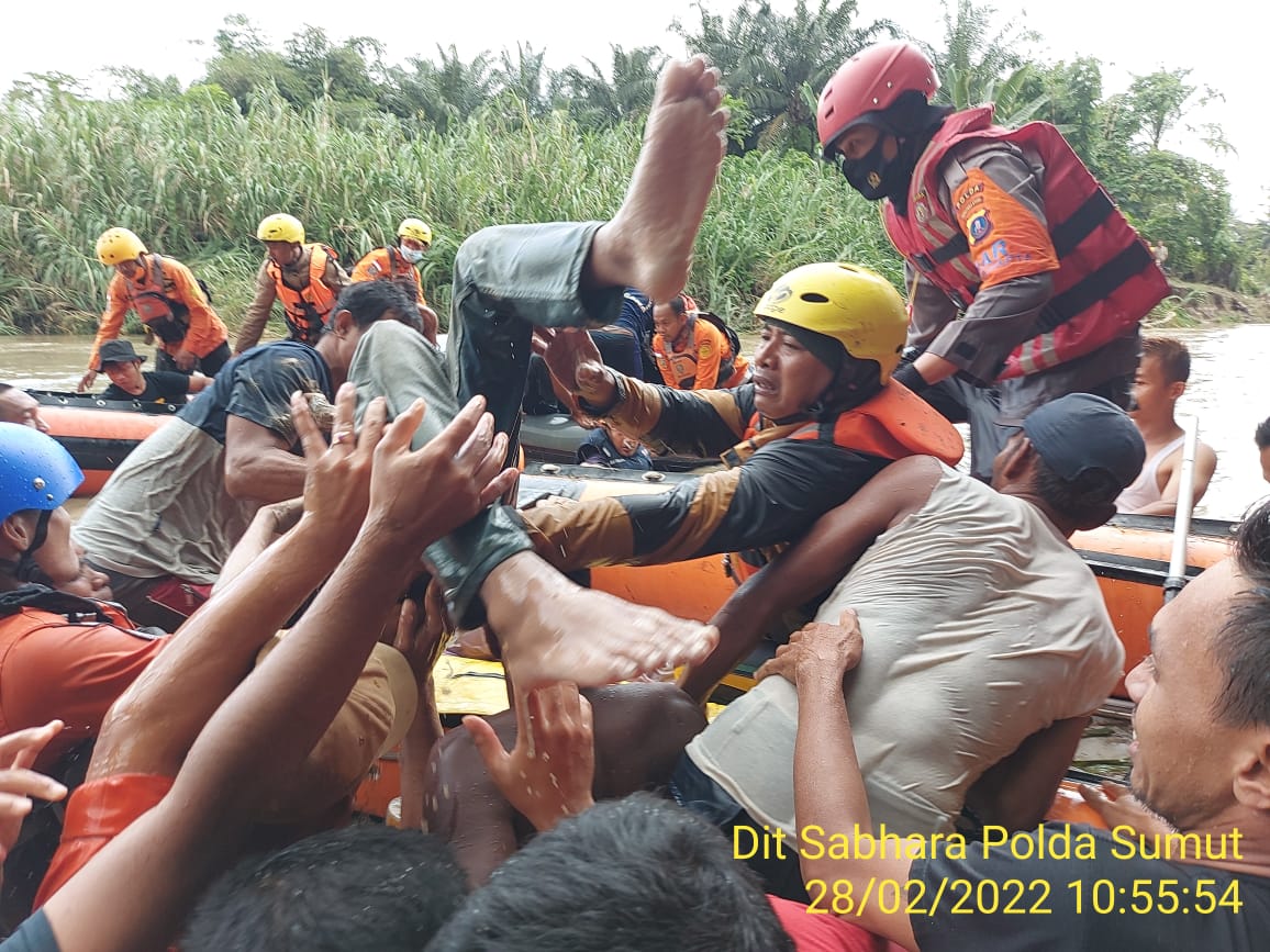 DELI SERDANG | Gerak Cepat Tim Gabungan yang terdiri SiPammat Dit Samapta Poldasu, BPBD dan SAR, serta dibantu oleh warga masyarakat telah berhasil menemukan dan mengevakuasi korban luapan air kecamatan Deli Tua Deli Serdang.Senin (28/02/2022)