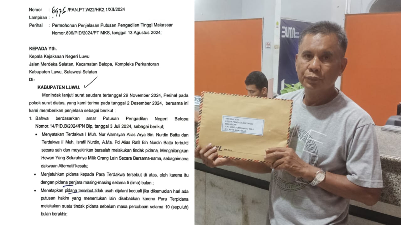 Surat tersebut menegaskan bahwa amar putusan PT Makassar tidak mencakup masa percobaan selama 10 bulan yang sebelumnya disebutkan. Meskipun telah ada penegasan dari PT Makassar melalui surat tersebut, Kejari Luwu masih beralasan bahwa penjelasan dari Pengadilan Tinggi Makassar masih kurang tegas.