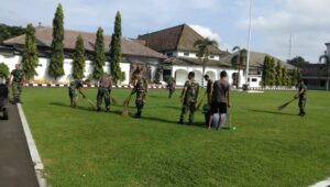 Selesai melaksanakan apel pagi anggota Makorem 064/MY melaksanakan korve pembersihan lingkungan, khususnya rumput liar di sekitaran Makorem.