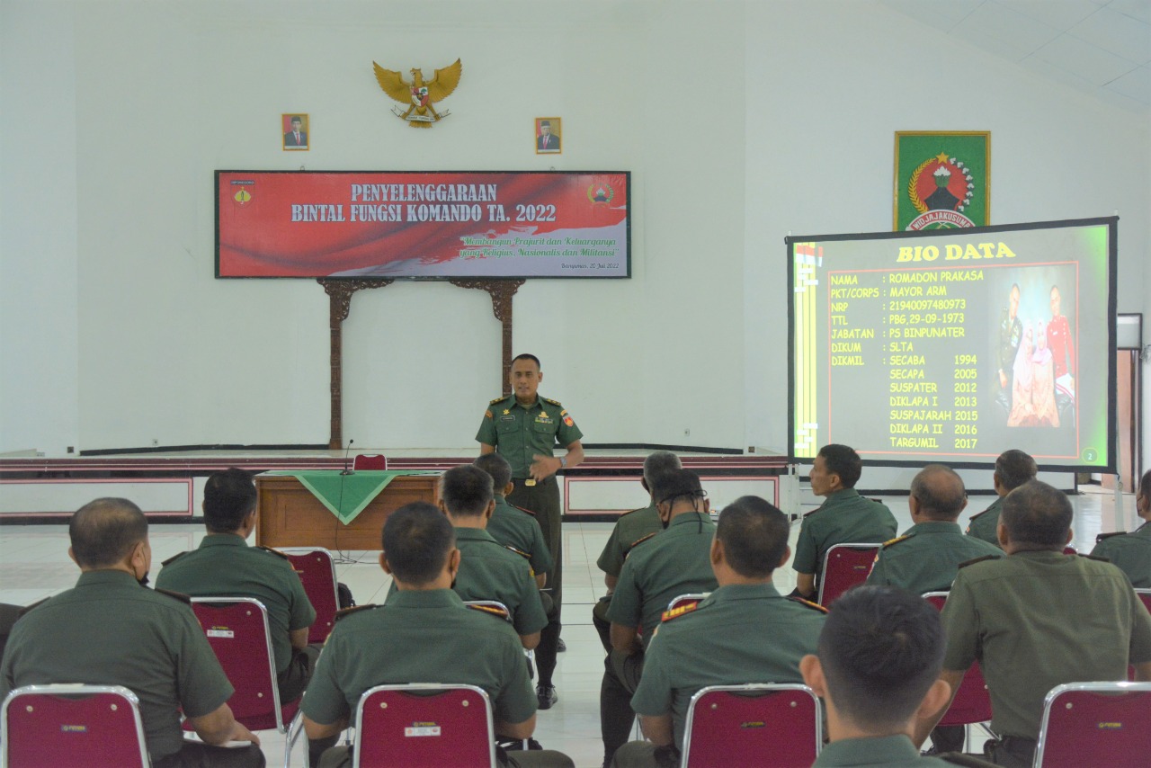 Bintal Fungsi Komando Tahun 2022 bertemakan “Membangun Prajurit dan Keluarga yang Religius, Nasionalis dan Militansi”, disampaikan oleh Mayor Arm Hidayat Romadon (Pasi Puanter Staf Ter Rem 071/Wijayakusuma) dengan materi Pokok-pokok Penyelenggaraan Bintal Fungsi Komando (BFK), yang diikuti para Pasi dan Danramil perwakilan Kodim jajaran Korem 071/Wijayakusuma.