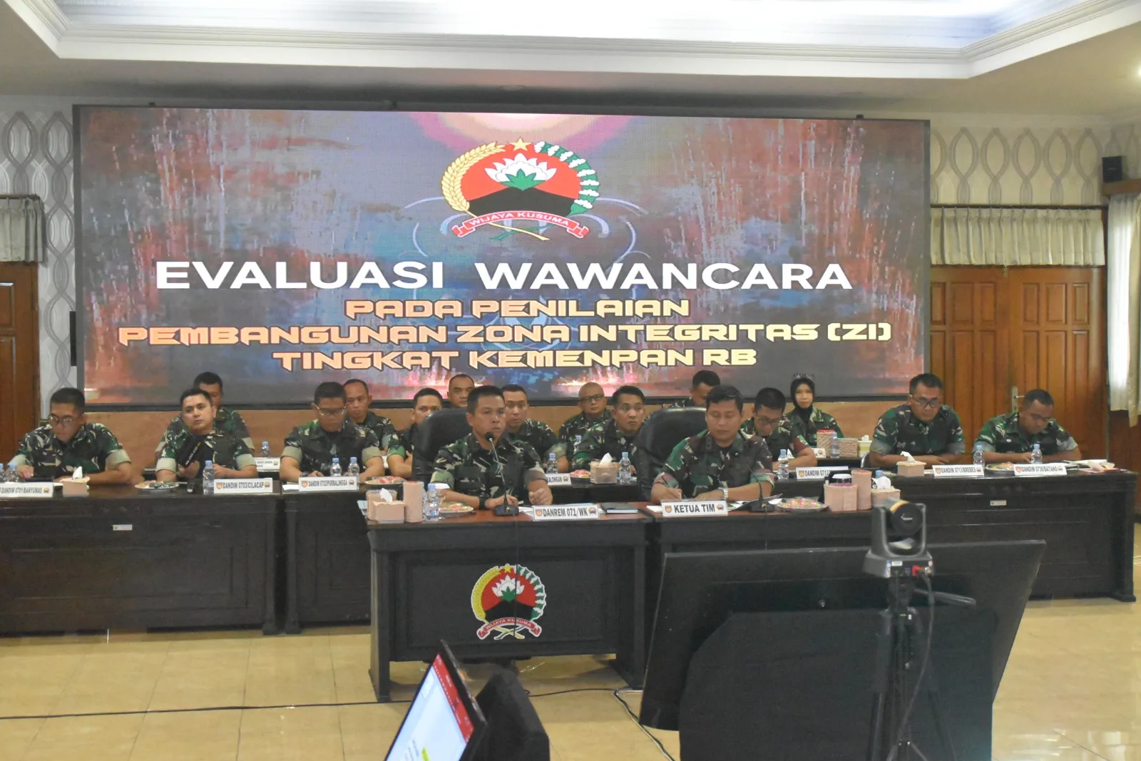 BANYUMAS – Dipimpin Danrem 071/Wijayakusuma Kolonel Inf Lukman Hakim, M.Han., dengan didampingi Kasrem 071/Wijayakusuma, para Dandim sejajaran Korem 071/Wijayakusuma dan para Kasirem 071/Wijayakusuma, laksanakan Desk Evaluasi Pembangunan Zona Integritas dari Tim Penilai Nasional Kementerian Pendayagunaan Aparatur Negara Reformasi Birokrasi (Menpan-RB), di Aula Sudirman Makorem 071/Wijayakusuma Sokaraja, Banyumas. Selasa (16/9/2025).