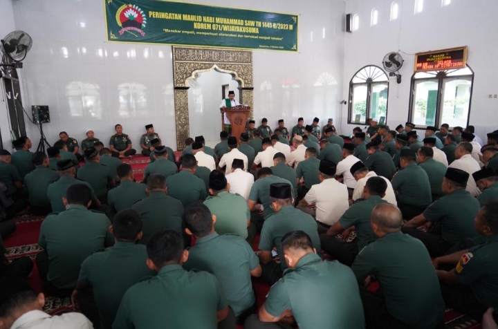 infoindonesiainews.com | BANYUMAS – Prajurit dan PNS Korem 071/Wijayakusuma mengikuti peringatan Maulid Nabi Besar Muhammad SAW 1445 H/2023 M di Masjid Wijayakusuma Makorem 071/Wijayakusuma Sokaraja, Banyumas, Selasa (3/10/2023).