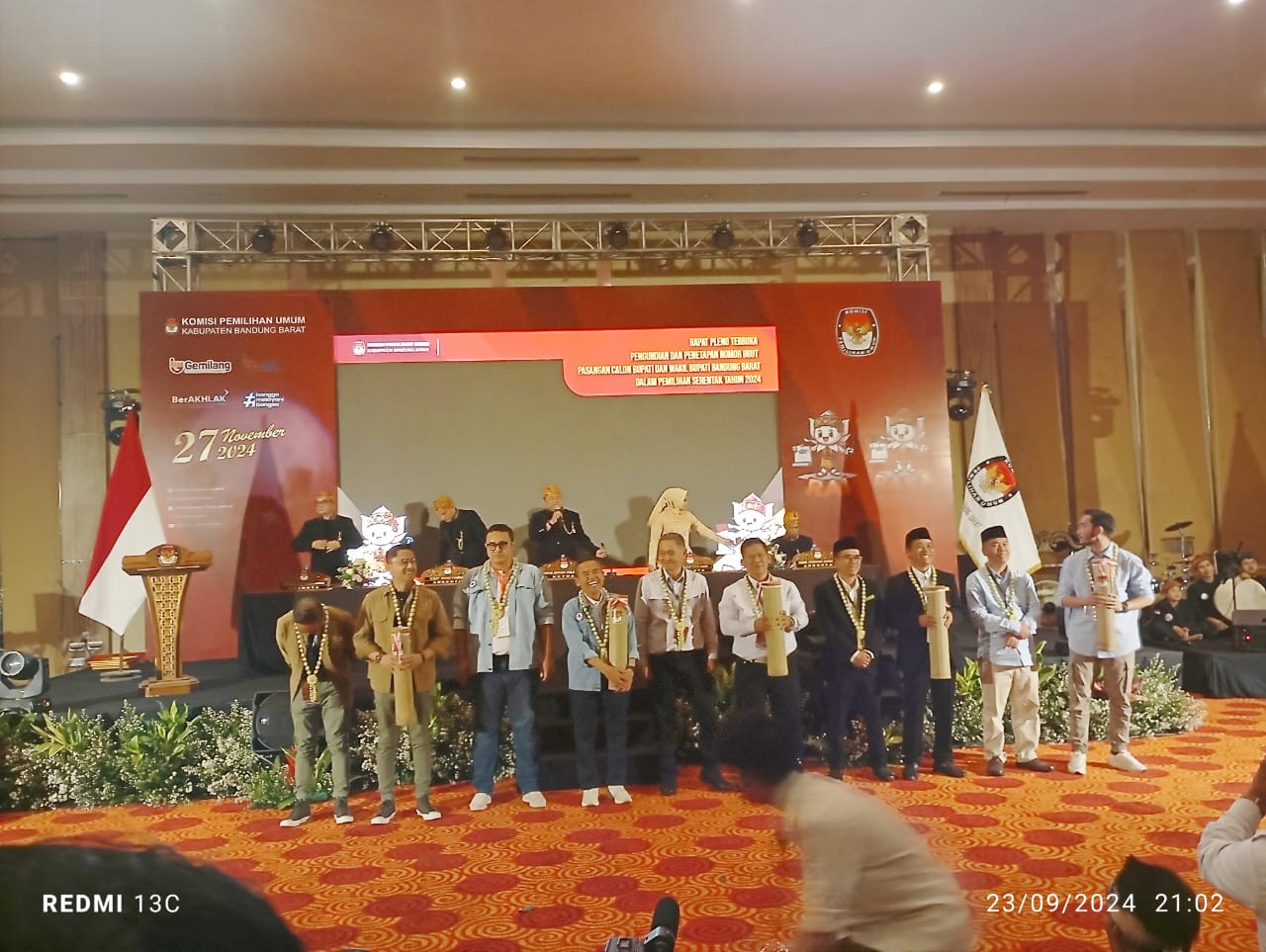 INFOINDONESIAINEWS.COM| BANDUNG BARAT, JABAR – Komisi Pemilihan Umum (KPU) Kabupaten Bandung Barat (KBB) menggelar rapat pleno penetapan dan pengundian nomor urut pasangan Calon Bupati dan Wakil Bupati Pilkada 2024. Acara tersebut di gelar di Hotel Novena, Kecamatan Lembang, Kabupaten Bandung Barat. Senin, (23/9/2024) malam .