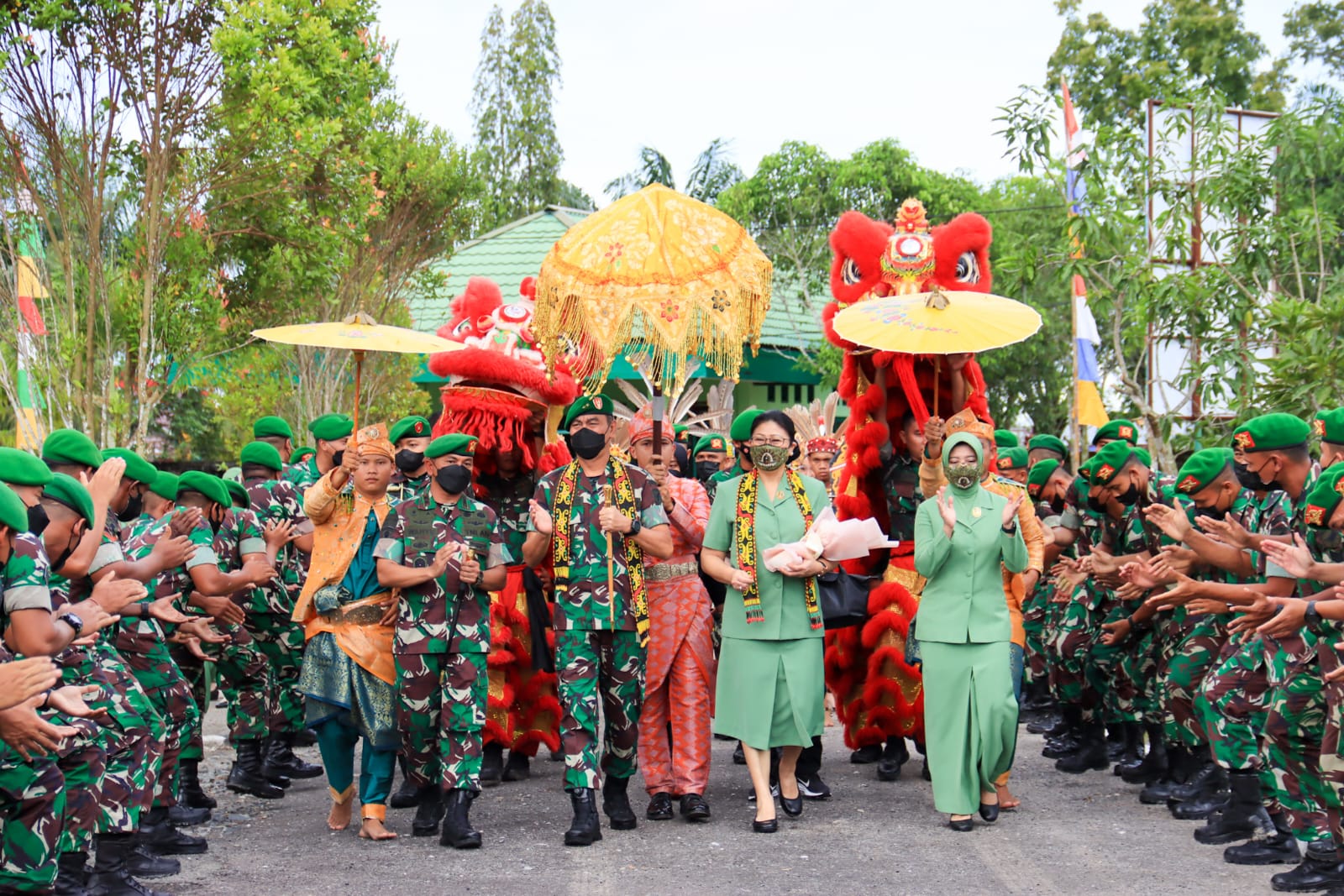 Kedatangan Pangdam beserta istri disambut oleh Danbrigif 19/Kh, Letkol Inf Wahyu Ramadhanus Suryawan dan Ketua Persit KCK Cabang LIX Brigif 19, Ny. Lendri Wahyu Ramadhanus Suryawan serta tari Barongsai dari para Prajurit.